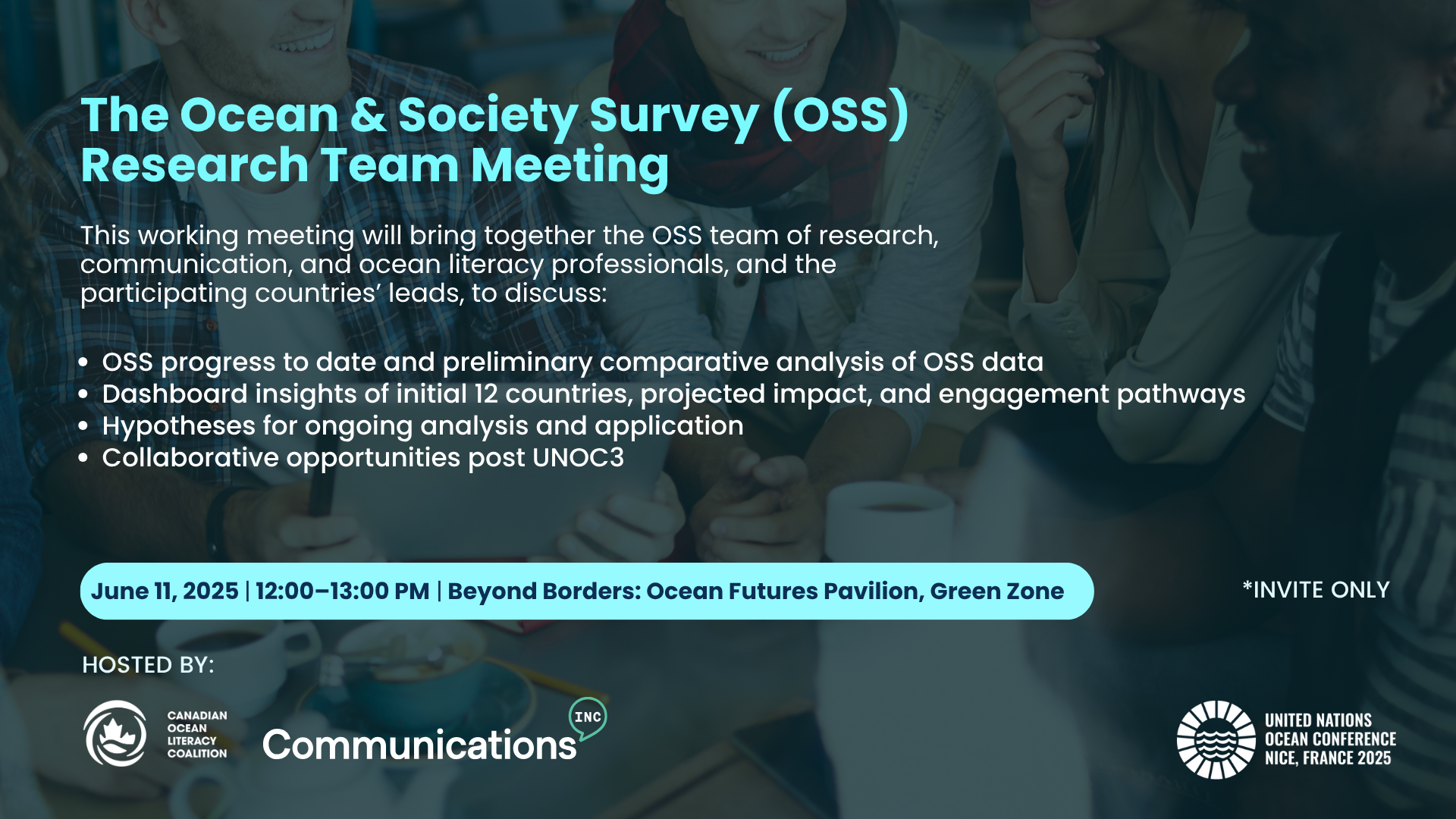 This working meeting will bring together the OSS team of research, communication, and ocean literacy professionals, and the 12 participating countries’ leads, to discuss: