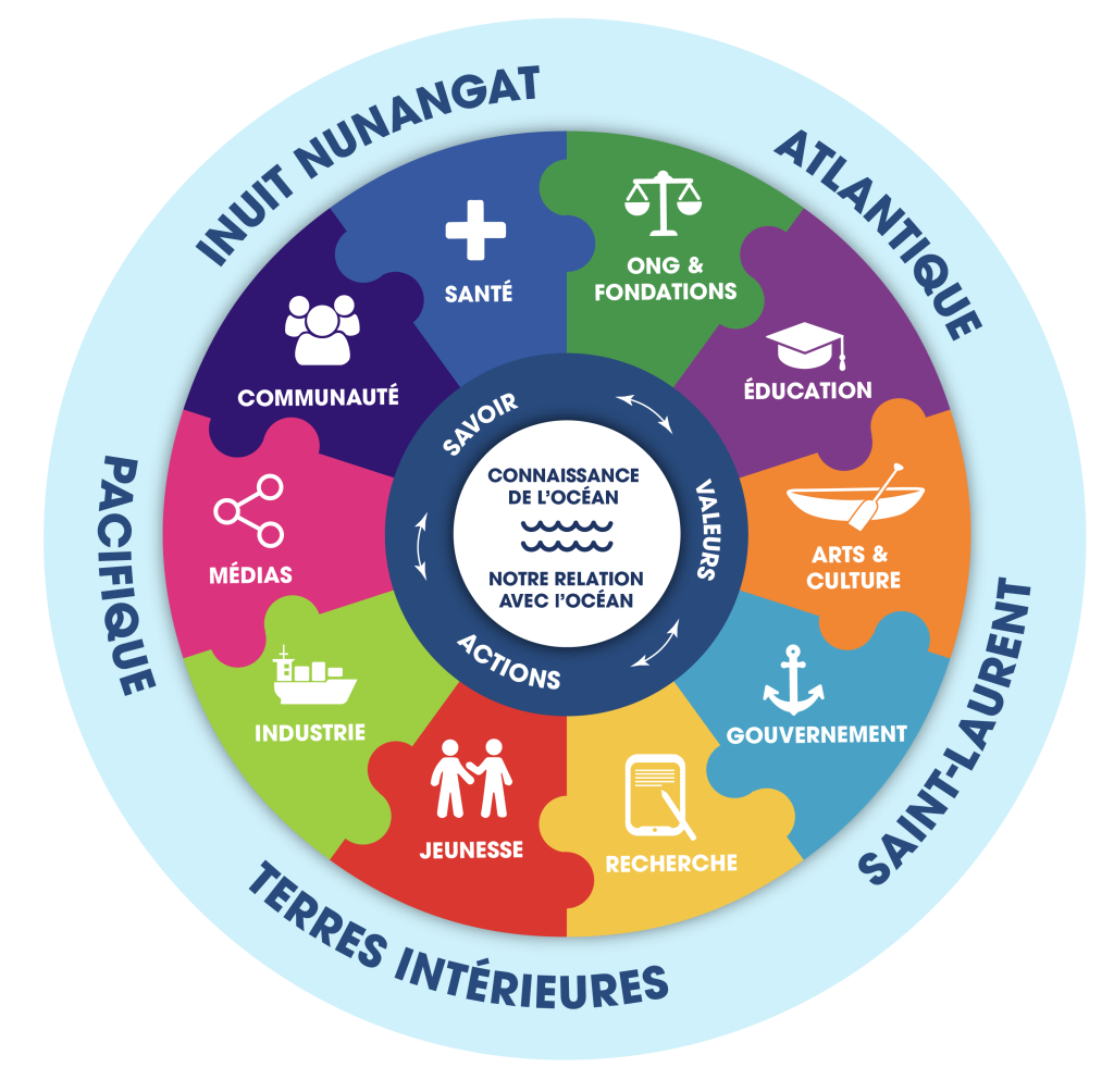 L’étude a examiné la connaissance de l’océan à travers cinq régions (Pacifique, Inuit Nunangat, Atlantique, Saint-Laurent et Canada intérieur) et dix secteurs : Éducation, Jeunesse, Gouvernement, ONG et fondations, Recherche, Industrie, Communauté, Médias, Arts et culture, ainsi que Santé.