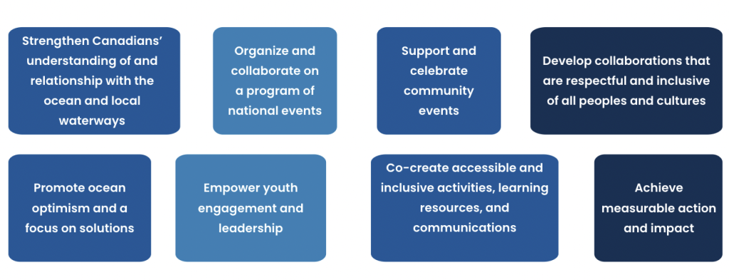 Through public events and activities held in cities and communities, from coast to coast to coast, we recognize the important role the ocean plays in our everyday lives and how local waterways connect us all with the ocean and each other. Together, we raise public awareness and connection to coastal areas, the ocean, and watersheds in Canada. We inspire action to help ensure a healthy ocean for current and future generations.